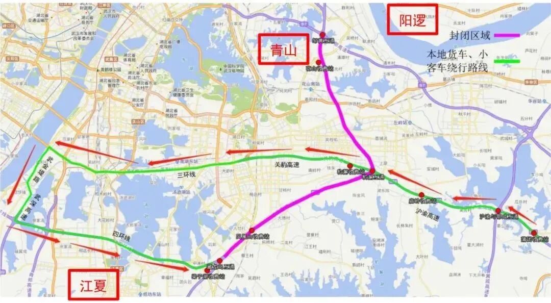 其他车辆通过沪渝高速→关豹高速→武汉三环线→武金堤路→武深高速→武汉四环线绕行。