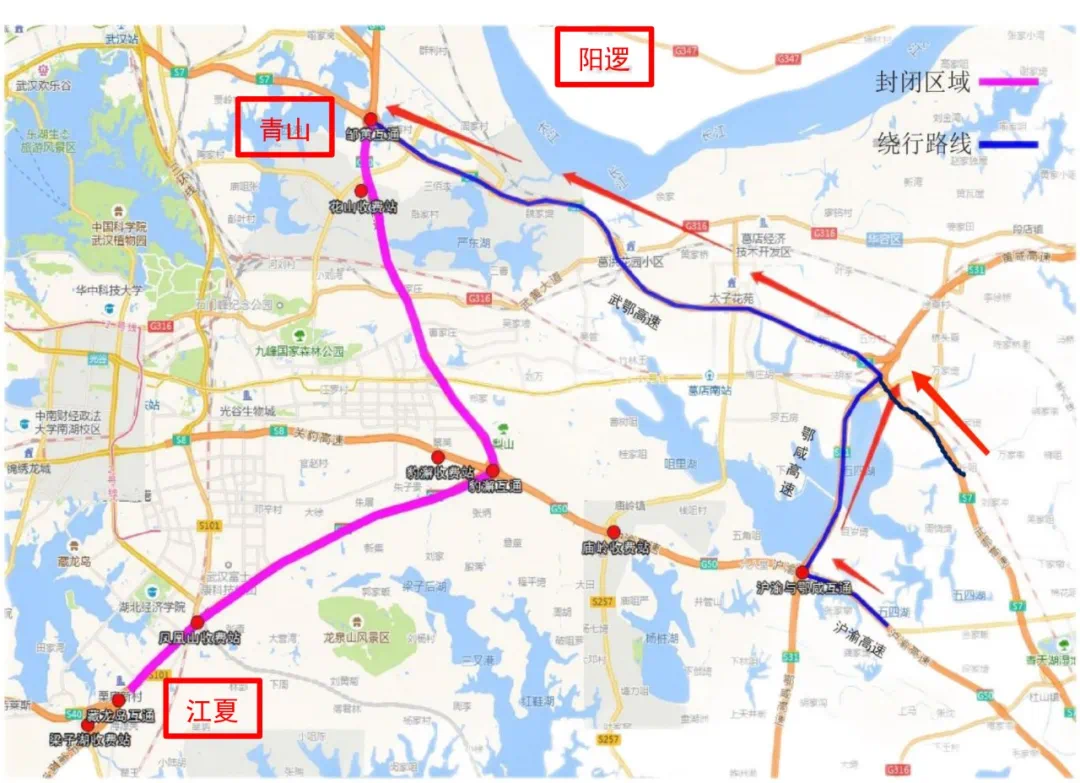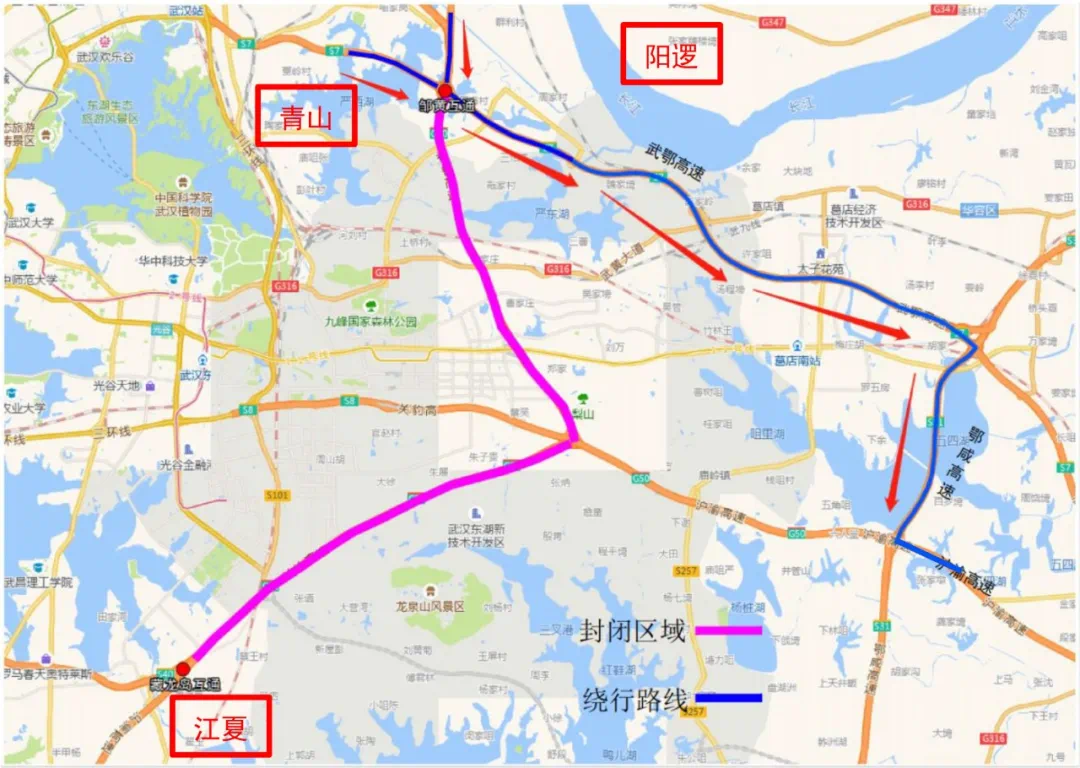 其他车辆通过藏龙岛互通→武汉四环线→武深高速→武金堤路→武汉三环线→武鄂高速→邹黄互通绕行。