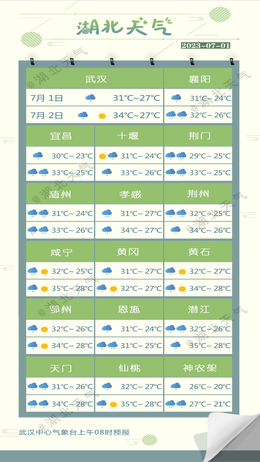 鄂西北阴天有大到暴雨;鄂西南、江汉平原北部、鄂东北西部阵雨转中到大雨;其他地区多云,局部有阵雨。