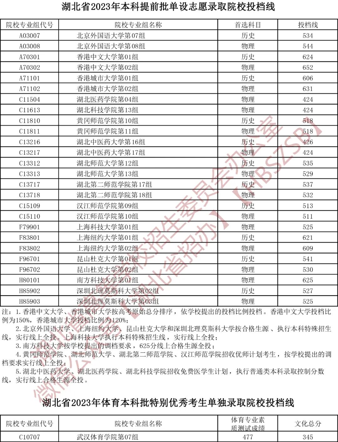 湖北省2023年本科提前批单设志愿投档线