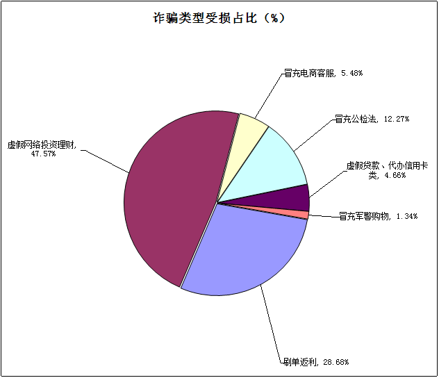 6月份,本县高发诈骗类型为刷单返利类,虚假网络投资理财类,共13起,损失分别30.75万元、51万元;群众财产损失次高的为冒称公检法类2起13.15万元;冒称电商客服类3起5.87万元,占比本月群众财产受损数12.27%和5.48%。