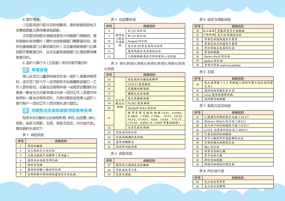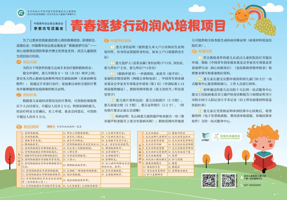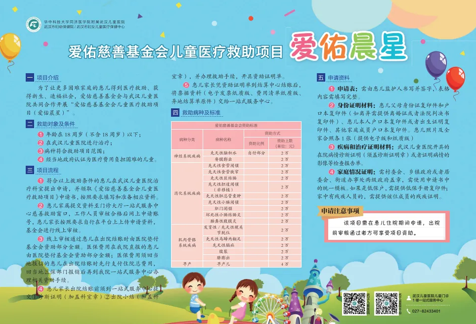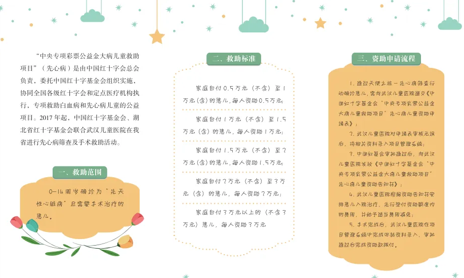 先心病(全病种)、血液病(4种)、恶性肿瘤(6种)救助5000元-4万元不等。