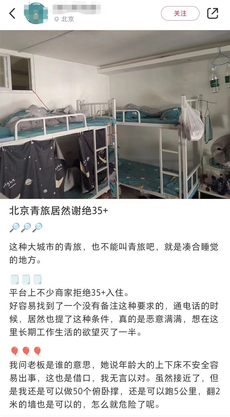 有网友在某社交平台上发帖称,北京有青旅拒绝接待35岁以上的人群。