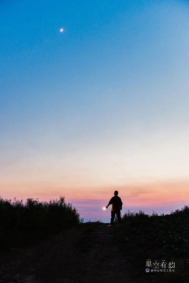 “20日傍晚时分,农历六月初三的一弯新月挂在西边天空,像女孩的眉毛,又像弯弯的镰刀。在新月左下方稍远一点的地方,很亮的那颗星就是金星,两者之间的角距离大约8度,相当于16个满月视直径(约为0.5度)大小,上演‘深情遥望’的浪漫一幕。”修立鹏说。
