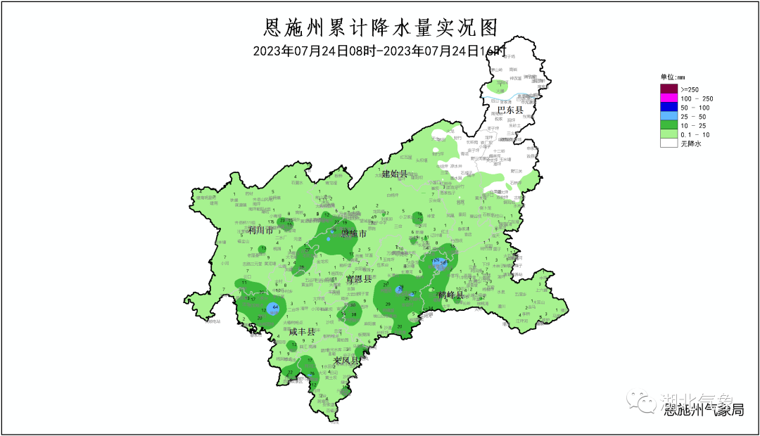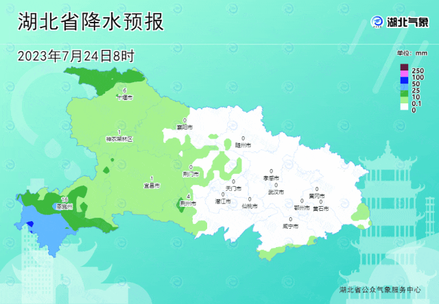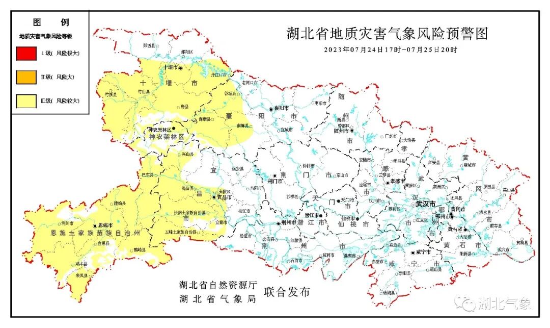 2023年7月24日17时—7月25日20时,预计三峡库区,神农架林区、恩施地区,十堰(十堰市城区、郧阳西南部、竹溪、竹山、房县、丹江口)、襄阳(谷城、保康、南漳)、宜昌(宜昌市城区、长阳、五峰、宜都)以及其他强降水区域发生崩塌、滑坡、泥石流的风险较大。