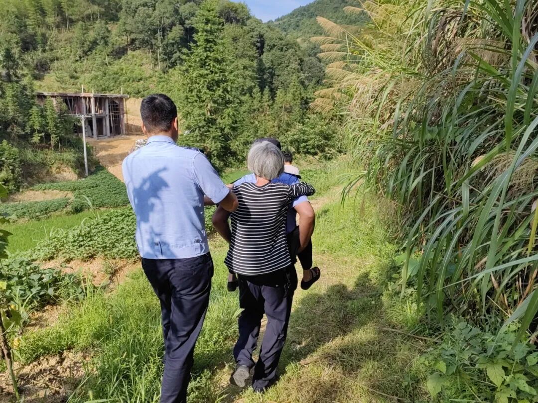 恰逢天气炎热,老人一天水米未进,民警第一时间查看并询问老人身体状况,发现老人全身打颤,呼吸急促,已无法表达,为避免老人中暑晕厥,现场警民合力将老人移至阴凉处解暑降温,待老人身体稍缓,民警随即将老人背负下山,通过及时救治,老人状态缓和。