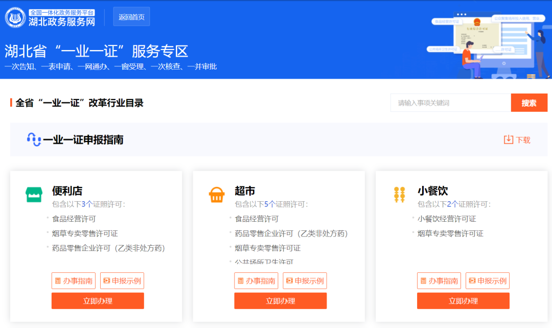 申办更加快捷。以往,经营食堂、烟酒行、休闲农庄等行业在办理完营业执照后还要奔走于各个许可部门窗口,少说几十天,多则几个月。如今,一表申请、一窗受理、一次核查、并联审批、一证准营,办理流程开启“跑步”模式,申请人只需通过湖北政务服务网登录“一业一证”专区平台选择需办理的相应行业,即可在线申报,也可以到各地政务服务中心“一业一证”综合服务窗口现场办理。6个新增“一业一证”改革行业的行政审批时限均不超过10个工作日。