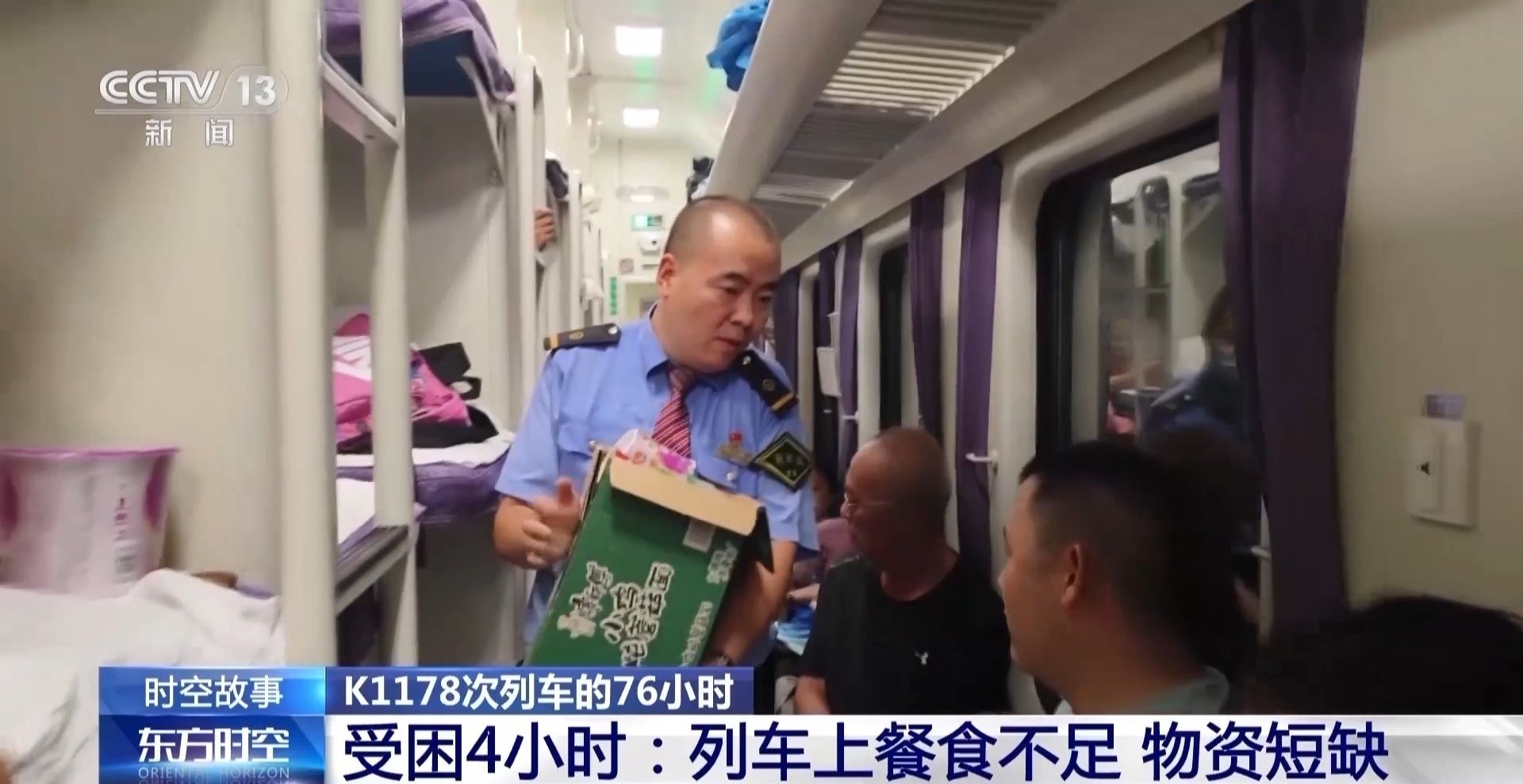 面对这样的情况,列车工作人员尽量安抚旅客情绪,但其实他们的心里也是焦急万分,因为列车上的剩余商品已不足晚餐供应,而紧急停靠的沿河城站站内物资十分有限。7月30日下午5:00左右,K1178次列车已经停车4小时。沿河城站工作人员将站内储备的方便面、八宝粥、火腿肠、鸡蛋等物资送上列车应急,免费发放给旅客。