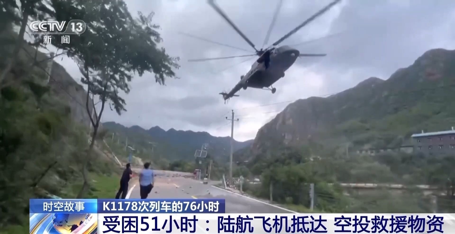 8月1日下午4:00,K1178次列车被困51小时后,某陆航旅4架满载应急物资的飞机,克服不利气象因素,在北京门头沟地区执行空投任务,并为K1178次列车空投救援物资。然而,由于沿河城站位于山谷中,地形狭长,周边环境复杂,再加上气象条件不好,空投一开始并不顺利。