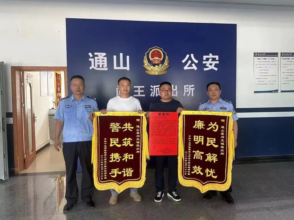 近日,中铁十五局集团咸九高速公路XJLX-3标项目经理先后来到通山县公安局闯王派出所和九宫山风景区派出所,将鲜红的锦旗和热情洋溢的感谢信分别送到了两个派出所民警手中,深情地对辖区派出所表示感谢!