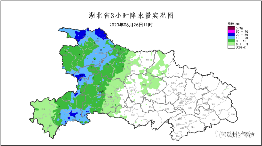 鄂西北西部阴天有大到暴雨;鄂西北东部、鄂西南阴天有中到大雨,局部暴雨;其他地区多云到阴天有阵雨或雷阵雨。省内部分地区伴有短时强降水。