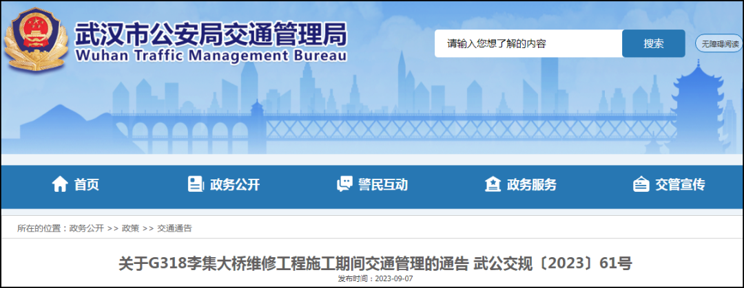 2023年9月16日至2024年3月16日,新洲区G318李集大桥将进行维修工程施工。为确保施工顺利进行,根据《中华人民共和国道路交通安全法》等法律法规的规定,现将该路段施工期间道路交通管理有关事宜通告如下: