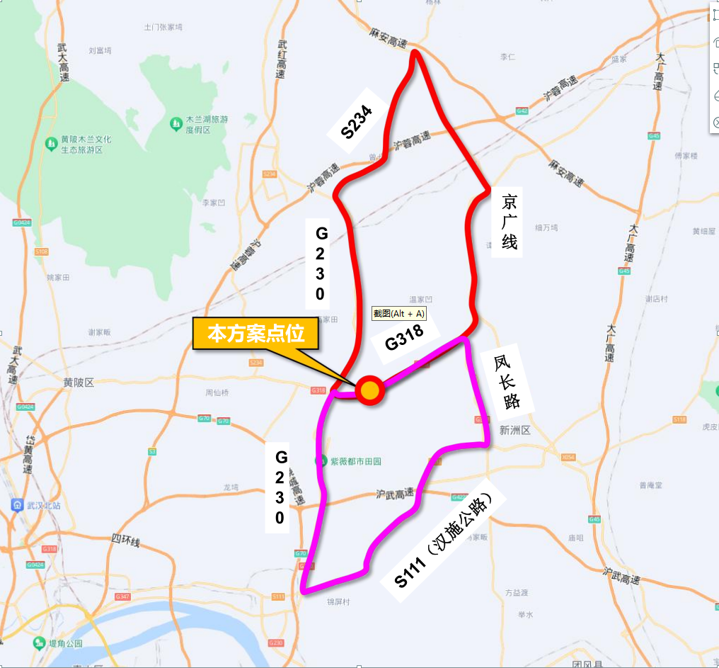 (2)李集大桥南侧绕行途径G230、S111(汉施公路)、凤长路。