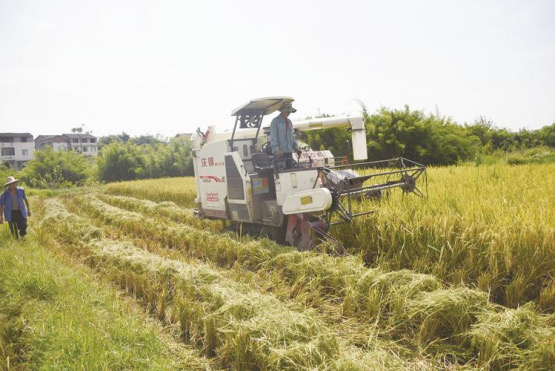 烈日下,在金色的麦田内轰隆隆的机械从收割到打谷高效率运作着。