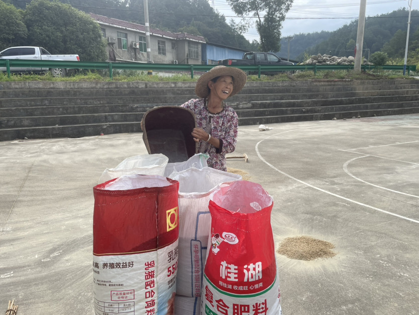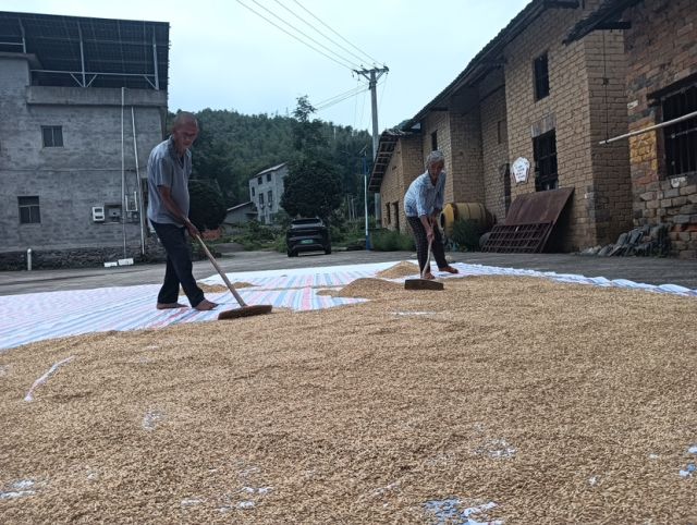 铺满稻谷的禾堂上农户拿着农具翻动着丰收的喜悦。