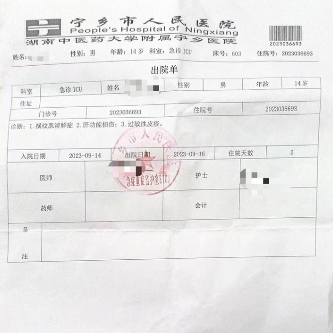 9月19日,刘同学母亲余某告诉新黄河记者,孩子今年14岁,正读初中,平时身体很好。目前孩子正在中南大学湘雅医院重症监护室接受治疗,此前被宁乡市人民医院诊断为横纹肌溶解症、肝功能损伤以及过敏性皮疹,并下达病危通知书,直至当日病情方有好转。