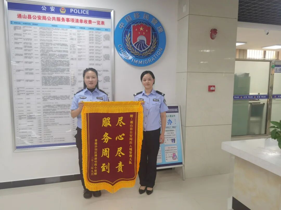 云上通山报道:9月18日,通山县公安局出入境管理大队收到了香港沙田区程女士邮寄来的一面写有“尽职尽责 服务周到”的锦旗,向提供高效、贴心服务的出入境管理大队表示衷心的感谢。