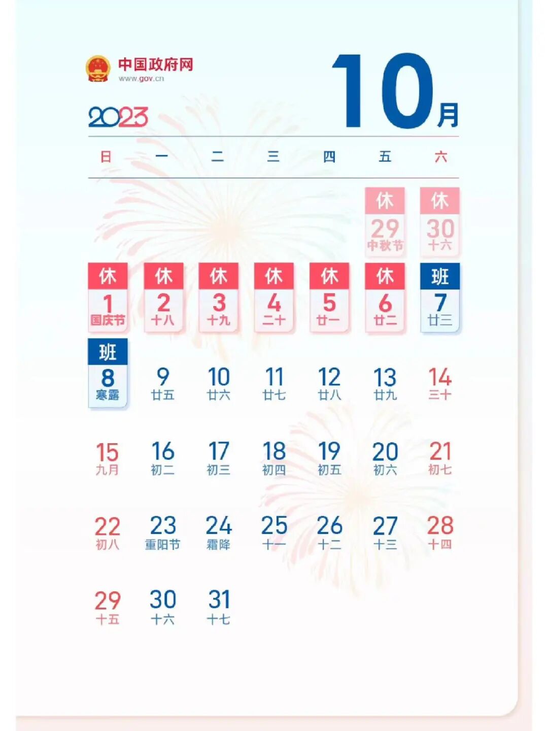 今年中秋国庆假期“合体”,9月29日至10月6日放假调休,共8天。节后10月7日、10月8日上班。期间,9月29日0时至10月6日24时全国收费公路对7座以下(含7座)小型客车免收通行费。