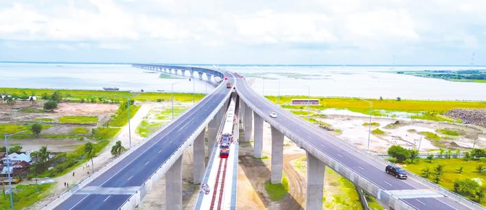 火车开过孟加拉国“梦想之桥”帕德玛大桥。