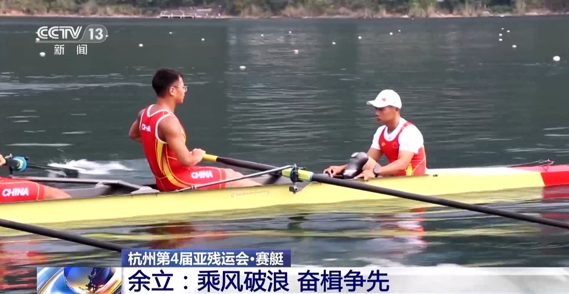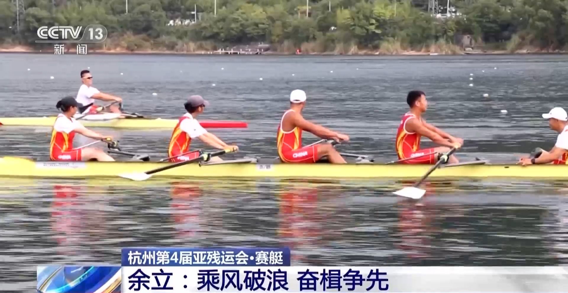 这里是千岛湖国家水上运动训练基地,参加亚残运会的赛艇队的运动员们正在抓紧训练,全力备战。赛艇尾部坐着的,就是掌舵人余立。