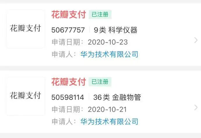 国家知识产权局官网显示,华为于2020年10月申请花瓣支付商标。2022年6月,花瓣支付被核准注册。