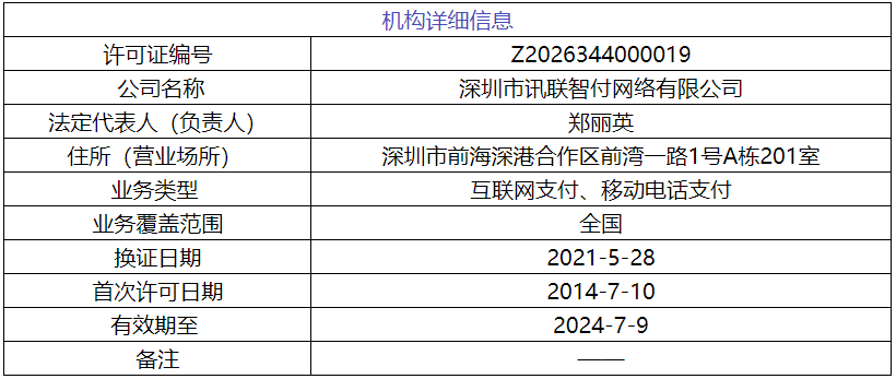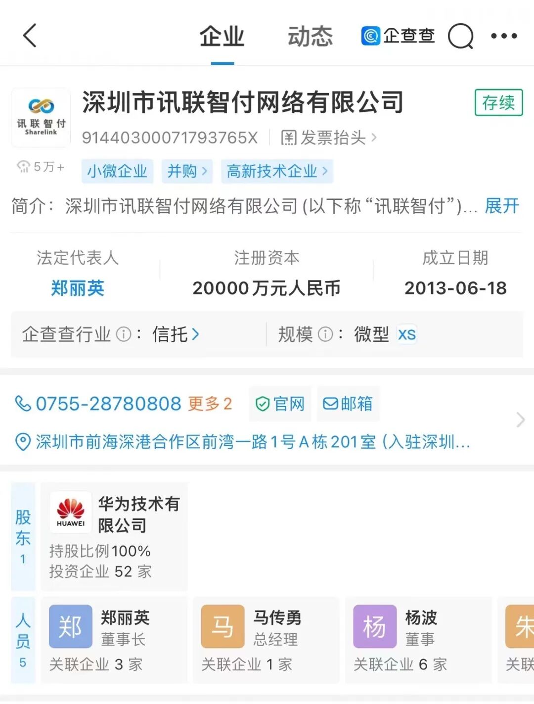讯联智付是华为旗下支付机构,2021年3月,讯联智付发生工商变更,华为成为唯一股东,顺利完成对讯联智付的收购。而讯联智付最早由中兴软件有限责任公司(以下简称“中兴软件”)出资,成立于2013年6月。2014年获得中国人民银行《支付业务许可证》,获准开展互联网支付、移动电话支付、数字电视支付等业务。不过后来在续展时,主动终止了“数字电视支付”业务。