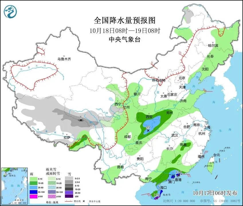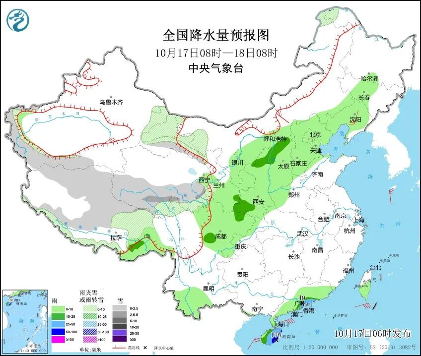 中央气象台预计,10月17日,新疆南疆南部山区、西藏、青海南部和东部、甘肃祁连山区等地的部分地区有小到中雪或雨夹雪;西藏东南部、陕西北部和西南部、山西北部、四川盆地西部、广东南部沿海、海南岛等地的部分地区有中到大雨,其中海南岛东部局地有暴雨或大暴雨。