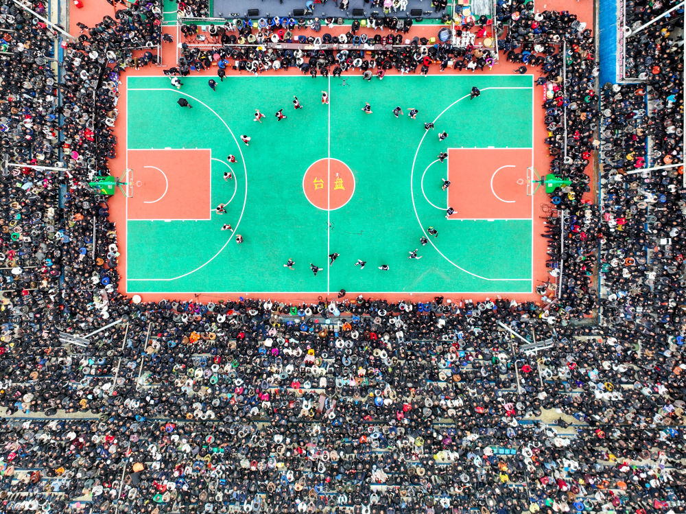 这是3月27日拍摄的比赛现场(无人机照片)。当日,贵州省首届“美丽乡村”篮球联赛总决赛在黔东南州台江县台盘村举行,黔东南州代表队以68比65的比分战胜遵义市代表队,获得冠军。新华社记者 欧东衢 摄