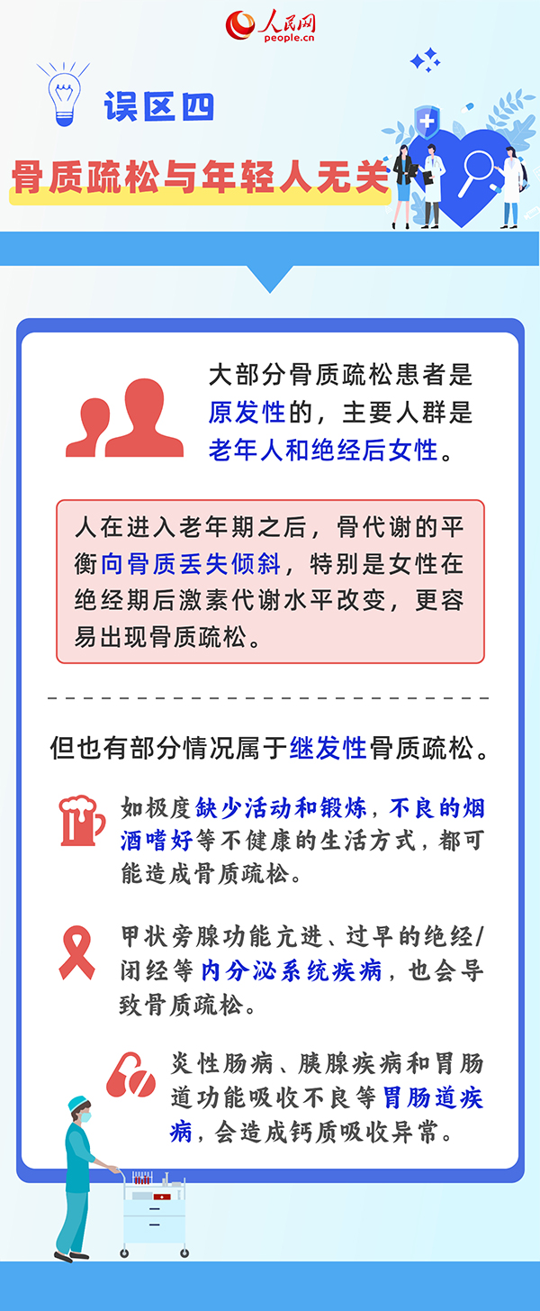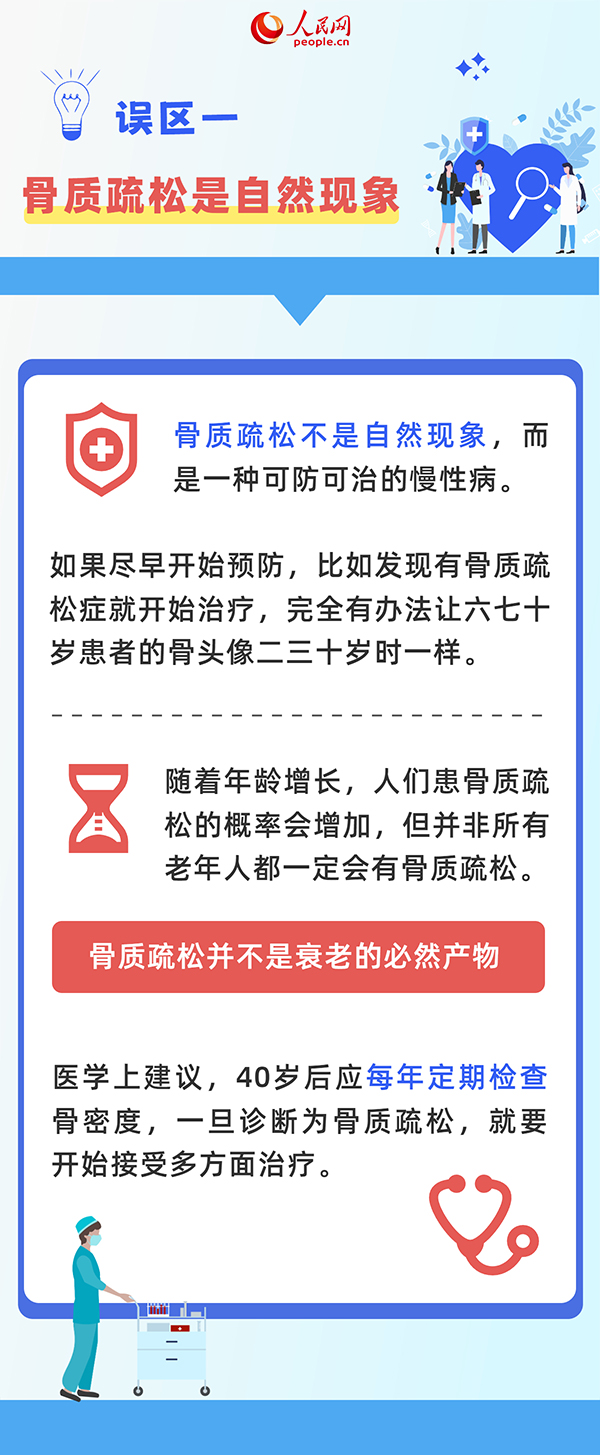 编者按:今天(10月20日)是世界骨质疏松日。骨质疏松是以骨量减少、骨组织微结构破坏,骨骼脆性增加和易发生骨折为特点的全身性疾病。随着人口的老龄化,骨质疏松已经成为全世界的健康问题。很多人认为,骨质疏松是老年人该关心的事。其实不然,骨质疏松的预防应从儿童时期开始。另外,还要认清这些常见误区,养成正确的饮食习惯,从而有效减少骨质疏松的发生。