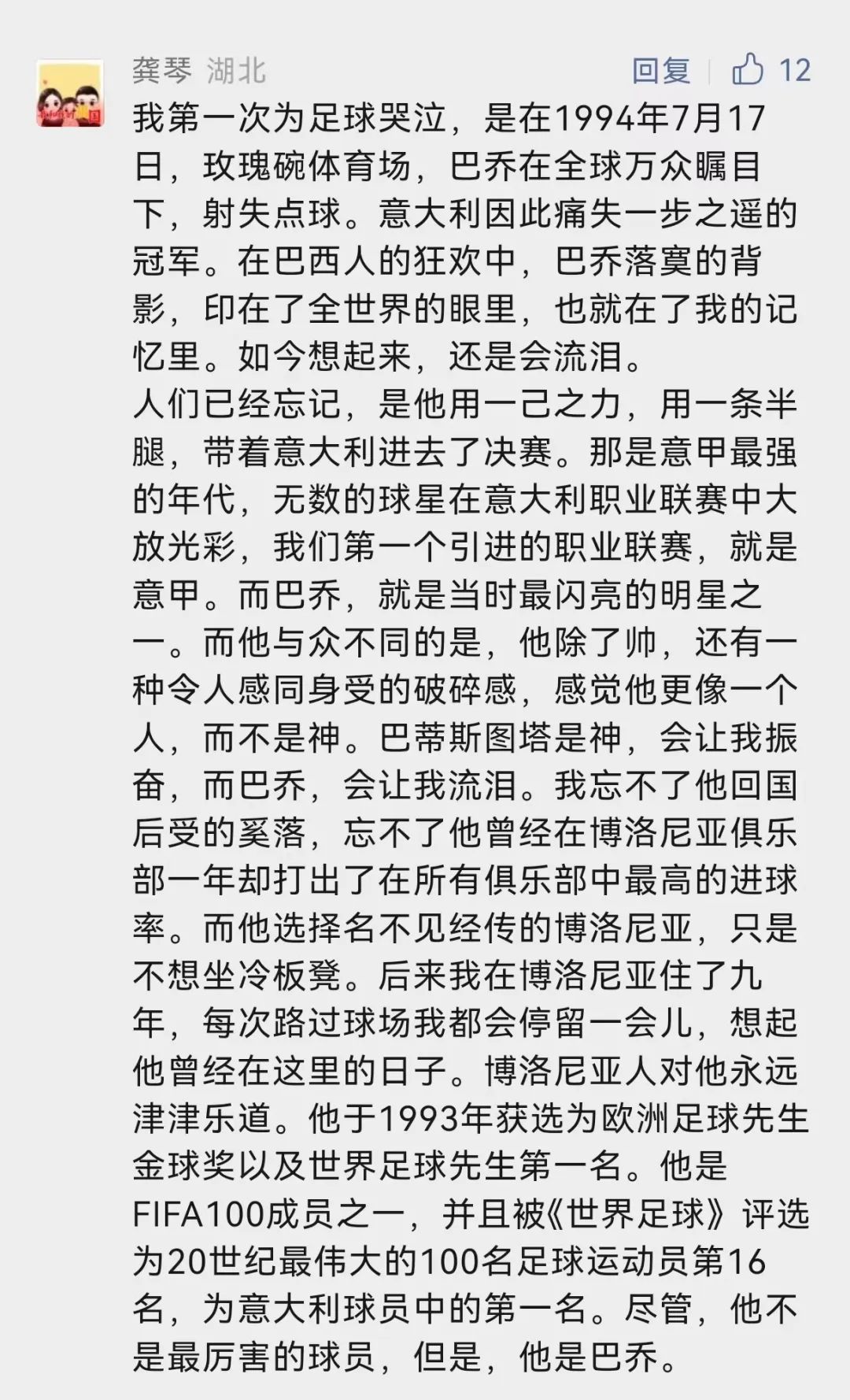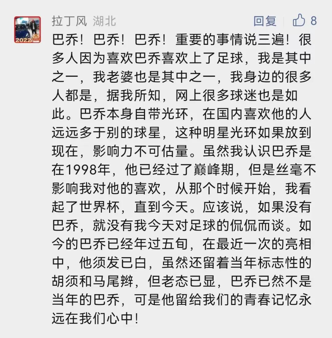 94年世界杯,罚失点球后失落的背影成就了足坛经典的“忧郁王子”。在一些老球迷的心中,巴乔就是第三代球王,他的气质令人着迷,他的人品令人敬佩。