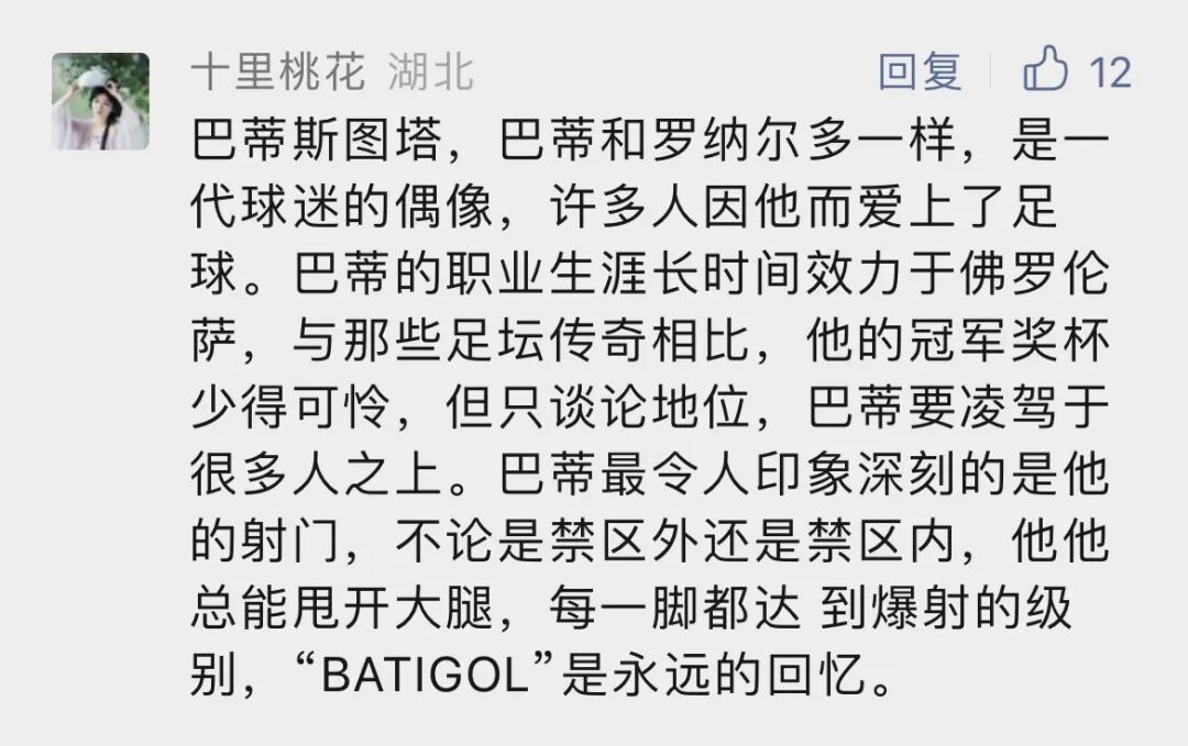 许多人因为巴蒂而爱上了足球。巴蒂的职业生涯长时间效力于佛罗伦萨。巴蒂最令人印象深刻的是他的射门,不论是禁区外还是禁区内,他总能甩开大腿,每一脚都达到爆射的级别,“BATIGOL”(巴蒂进球)是永远的回忆。