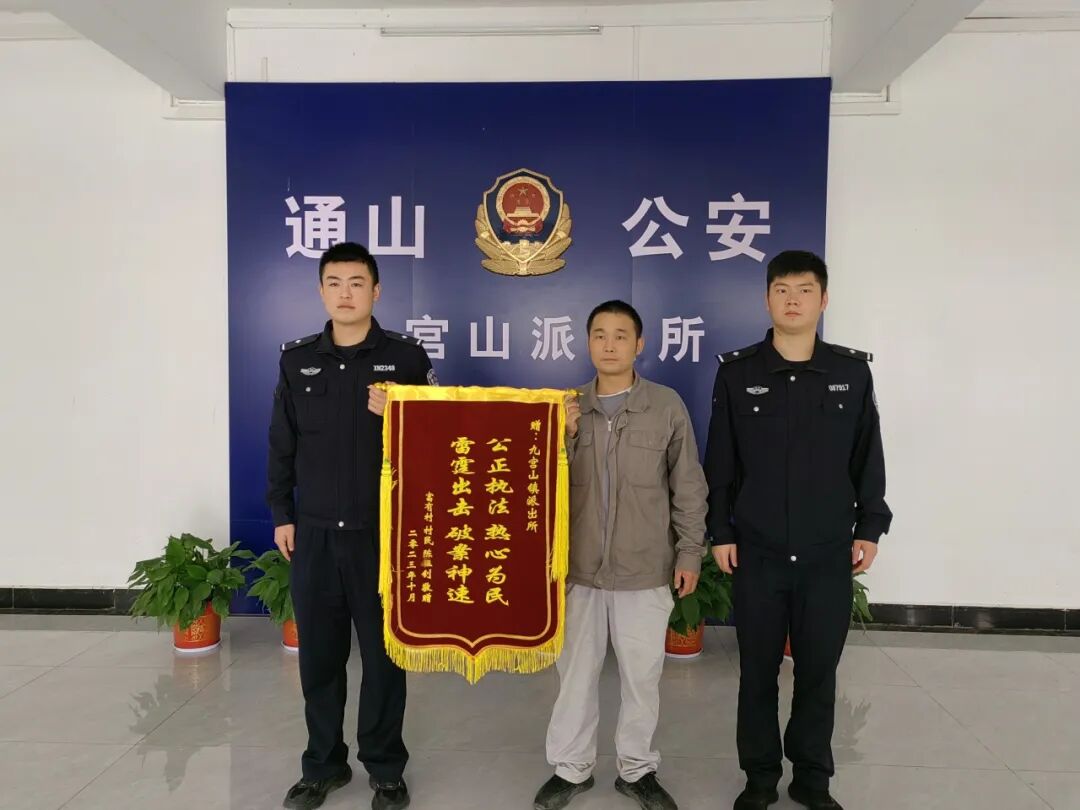 事后,群众陈某钊将一面印有“公正执法热心为民,雷霆出击破案神速”的锦旗送到九宫山派出所民警手中,以表达对民警快速破案挽损的感激之情。