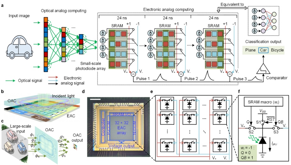ACCEL光电计算芯片不仅成功完成了交通场景判别、高分辨率图像识别、弱光计算等实际场景中的智能视觉任务,且耗时和功耗不到目前高性能芯片的千分之一。同时,基于研发出的自适应训练算法,该芯片仅采用百纳米级工艺精度,就可取得比先进制程芯片多个数量级的性能提升,实现性能的飞跃。