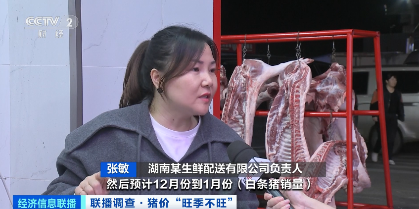 湖南某生鲜配送有限公司负责人 张敏:10月份到11月份(每天销量)是450头到600头。预计12月份到1月份(白条猪销量)会增长到一天800头到1000头。