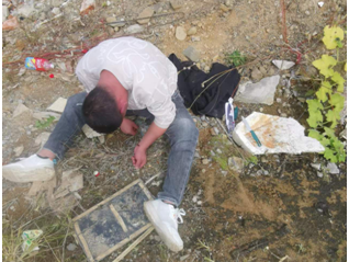 11时37分,经过一番苦寻,网格辅警胡北海在污水处理厂旁河边发现该男子躺在河边,旁边有一把十厘米小刀和两瓶酒瓶、一盒花生米,左手腕上有一道伤口,该男子看似已呈昏迷状态。