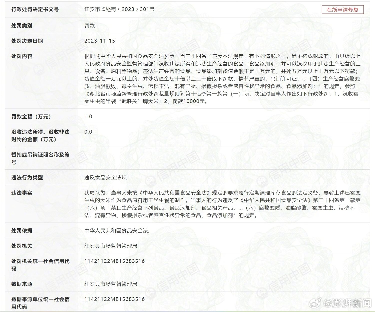 该文件显示,依据《中华人民共和国食品安全法》的规定,参照《湖北省市场监督管理行政处罚裁量规则》,红安县市场监督管理局决定对当事人作出如下行政处罚:没收霉变生虫的半袋“武胜关”牌大米;罚款10000元。