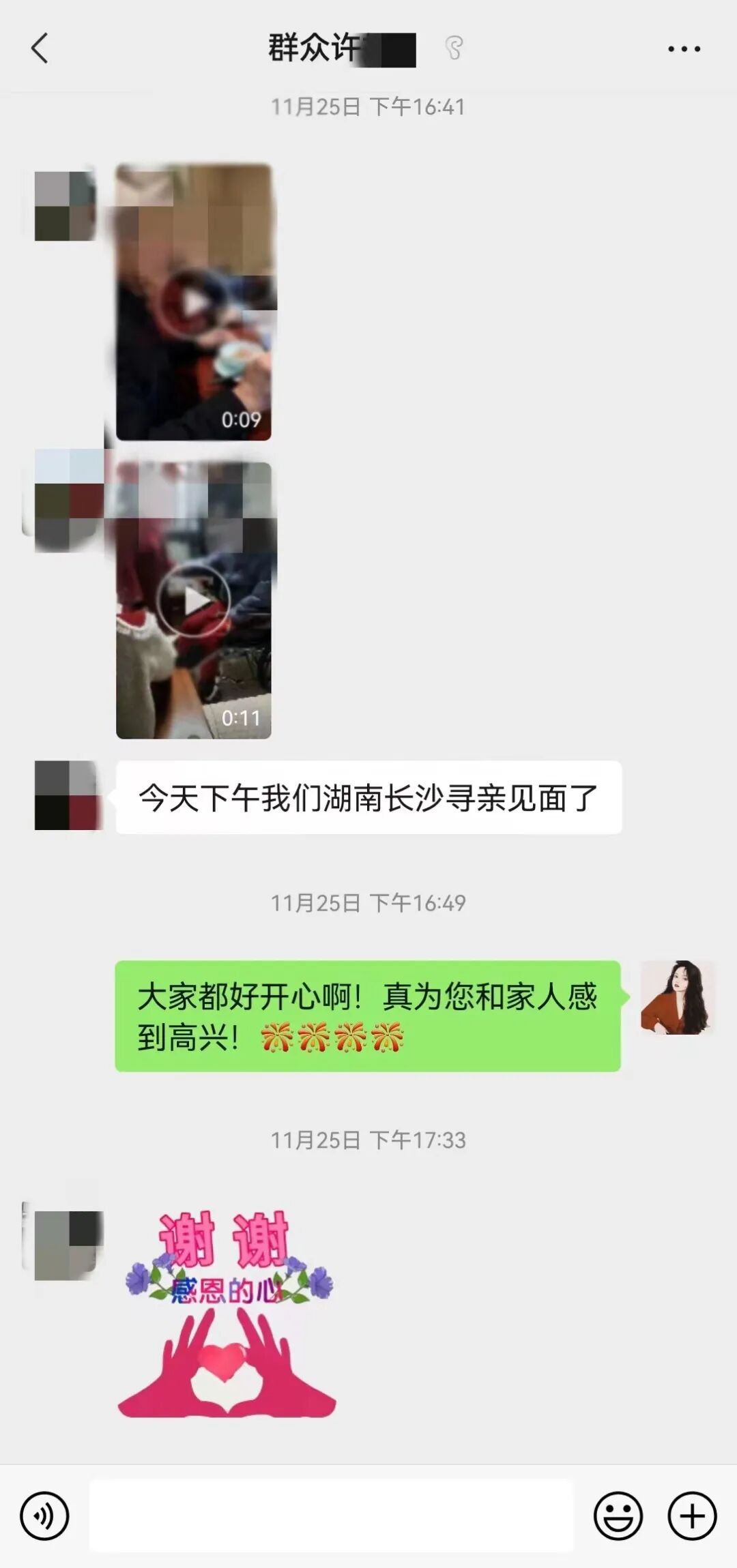 11月26日,罗某春丈夫许先生通过微信给户政工作人员发来了许多视频、照片,分享亲人见面时的激动和愉悦,并对户政部门民警的帮助连声表示感谢。