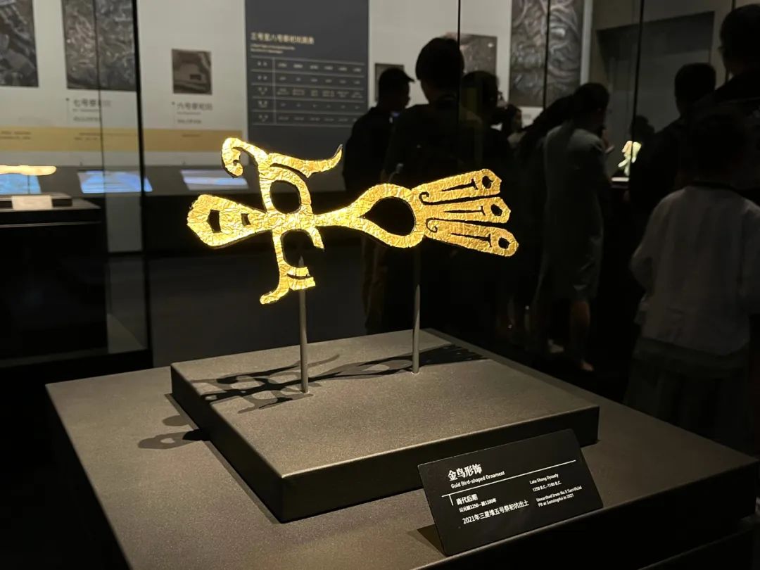 三星堆遗址三期文化遗存距今约3300年-3100年(约当商代后期),重要遗迹有仓包包城墙、青关山等地点大型建筑遗迹和三星堆地点祭遗存。主要遗物有青铜器、金器、玉器和陶器等类,其中,青铜器有尊、罍、大立人像、神树、人头像、面具、神坛等,金器有面具、金杖等,玉器有璋、戈、璧、琮等,陶器有三足炊器、高领瓮、觚形器、高柄豆、厚唇侈口缸、矮领瓮、鸟头柄器、盉、平底罐等。
