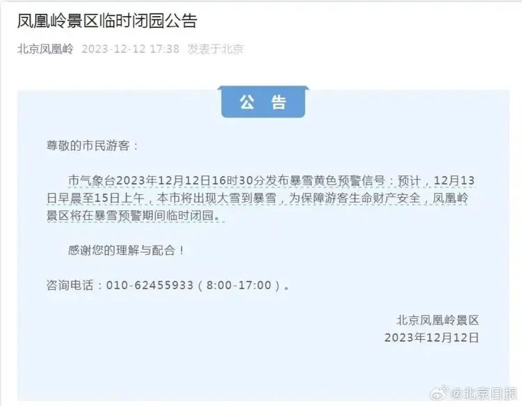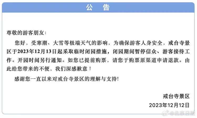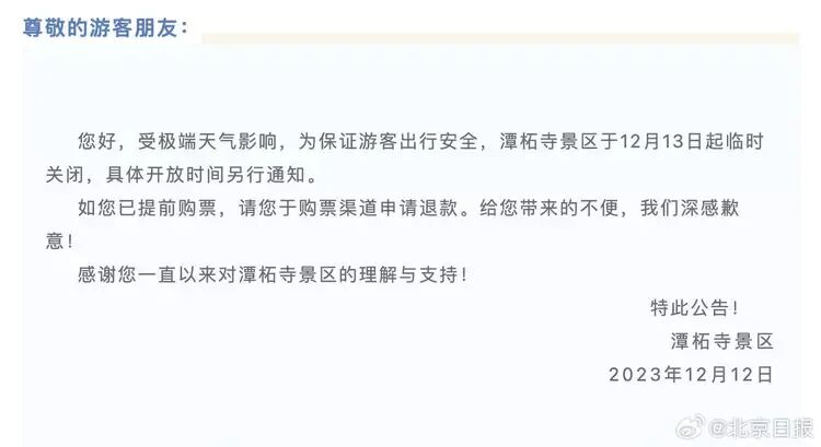 目前,北京已有多家景区发布通知,13日起临时关闭↓