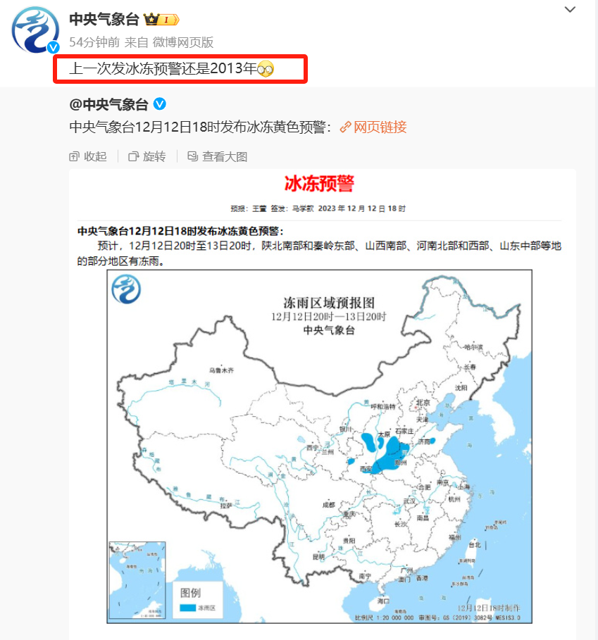 另据中央气象台消息,上一次发冰冻预警还是2013年。