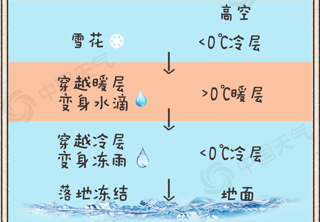 冻雨的形成,首先需要强冷空气使得地面温度降至0℃以下;其次,还要有暖湿气流配合形成降水;更为重要的是,大气中必须存在一种特殊的三层结构,就像一块“夹心糖”一样,上下冷、中间暖。
