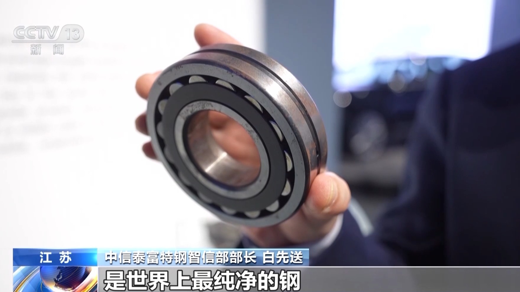 中信泰富特钢智信部部长 白先送:我现在手上拿的这个轴承钢是世界上最纯净的钢,它的纯净度是同行业的2.5倍。超厚板它的厚度超过了610毫米,单体重量超过了50吨,主要用于高端装备的制造。这个钢丝是通过我们的钢材,拉拔3000公里不断丝,直径比我们头发丝还要细。这个是大桥缆索,它是全世界强度最高的钢材制造的,整个大桥缆索超过了4万根的这个钢材,它的每一根钢材可以吊起4辆轿车的重量。