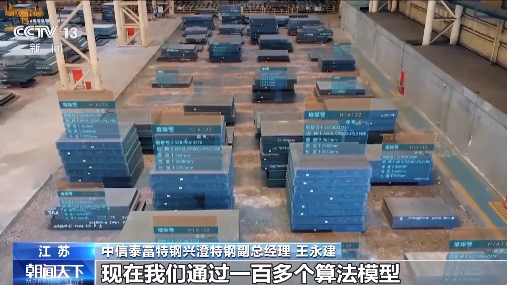 中信泰富特钢兴澄特钢副总经理 王永建:比如说你订了0.8吨,他订了1吨,他订了2吨,根据用户的需求,我会对这个板进行二次切割,比如生产1吨钢材客户要求0.5吨的碳排放,我就按照0.5吨的碳工艺路线来设计生产流程。我们原先都像瞎子摸象,完全靠经验来进行操作。现在我们通过一百多个算法模型,保证用户的订单需求。
