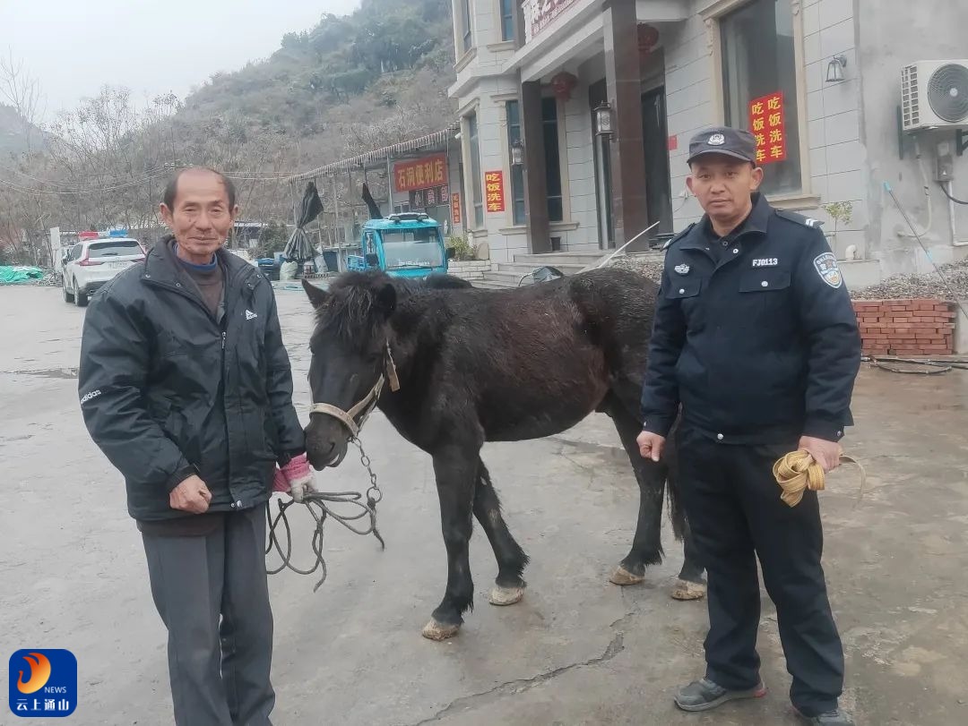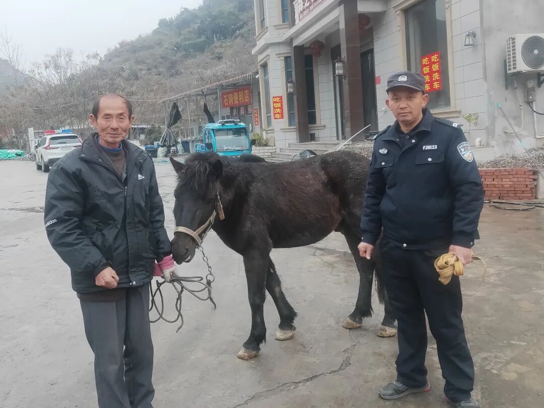 值班民警赶到现场后,一边前往就近村湾走访寻找失主,一边通过警民微信群、乡亲群等发布马匹认领信息,发动更多的社会力量帮助寻找马主人。经过“互联网信息传递+铁脚板实地探访”一个小时的努力,最终了解到这匹马是来自与贾家源相邻的江西省武宁县泉口镇纽丝村八组,随即民警与马主人全某取得联系让其前来认领。