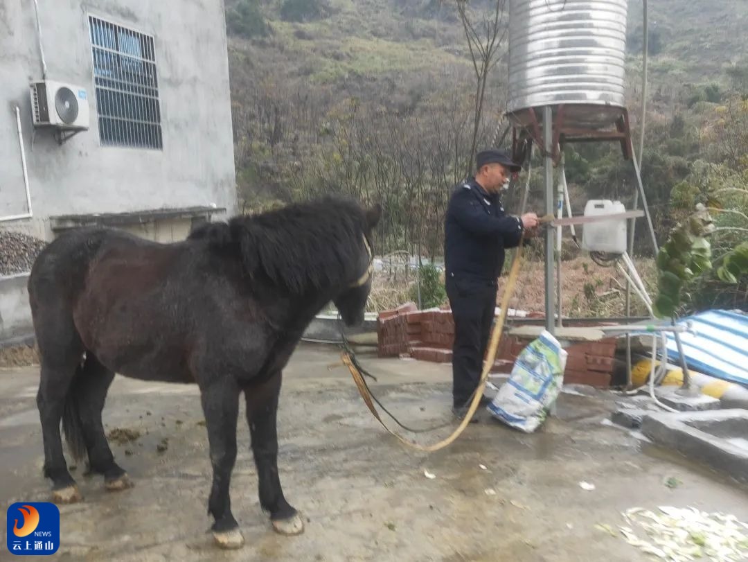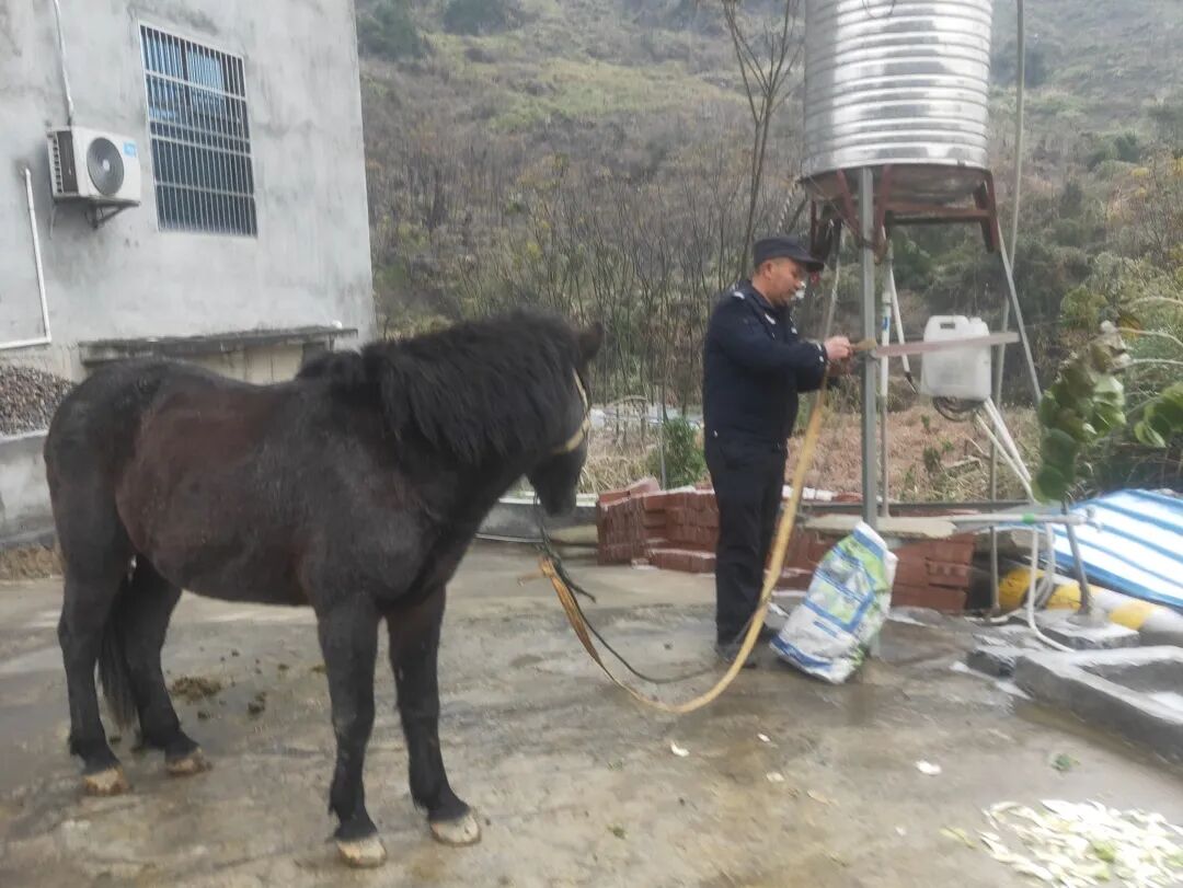 为防止群众经济财产受损以及预防交通安全事故发生,村辅贾松霖第一时间向所里汇报该情况,并冒着寒冷骑车上前追上马匹,充当起“牧马人”将迷路马儿牵回自家院子里进行喂食。
