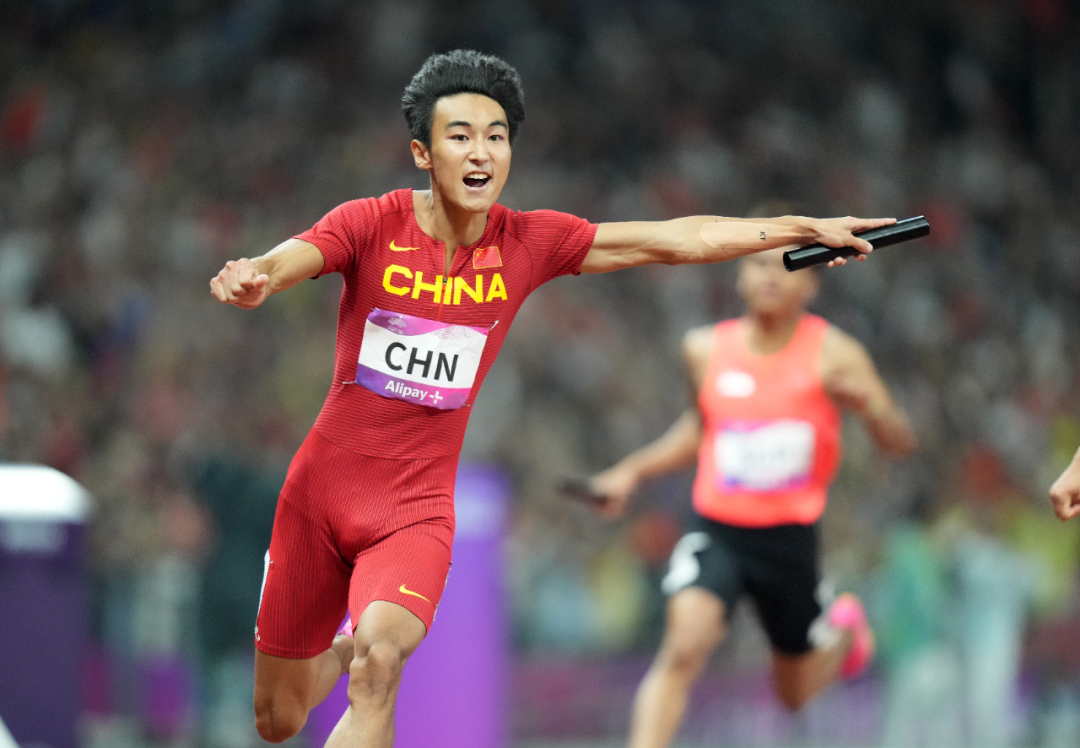 2023年10月3日,中国选手陈佳鹏在比赛中冲线。当日,杭州亚运会田径项目男子4x100米接力决赛在杭州奥体中心体育场举行。中国队夺得冠军,日本队获得亚军,韩国队获得季军。新华社记者 孙非 摄