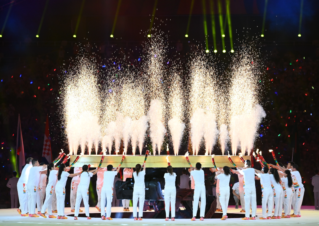 这是2023年7月28日拍摄的开幕式点火仪式。当晚,第31届世界大学生夏季运动会开幕式在成都东安湖体育公园主体育场举行。新华社记者 张博文 摄