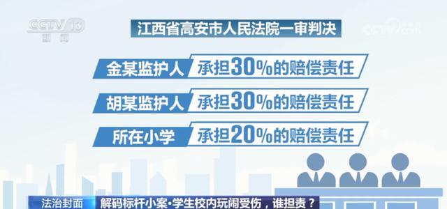 日前,江西省高安市人民法院一审判决金某监护人、胡某监护人、所在小学分别承担30%、30%、20%的赔偿责任,原告刘某自行负担损失的20%。目前,该案判决已生效。