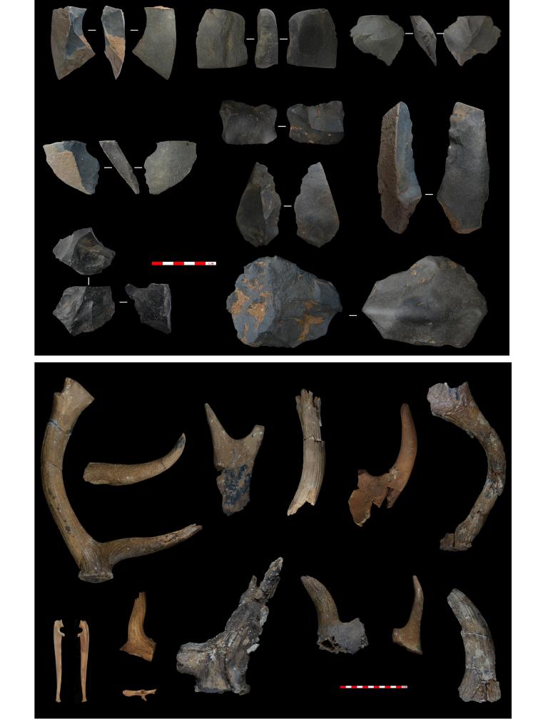 第一期遗存——石制品(上);第一期遗存——动物化石(下)。(资料图片由中国科学院古脊椎动物与古人类研究所提供)