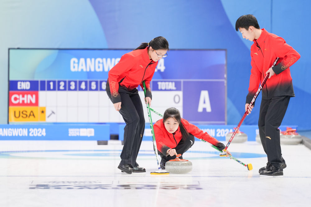 冰壶赛场,在混合团体小组赛中,由李泽泰、陈早雪、张鸣航和高雅组成的中国队以6:5战胜美国队。